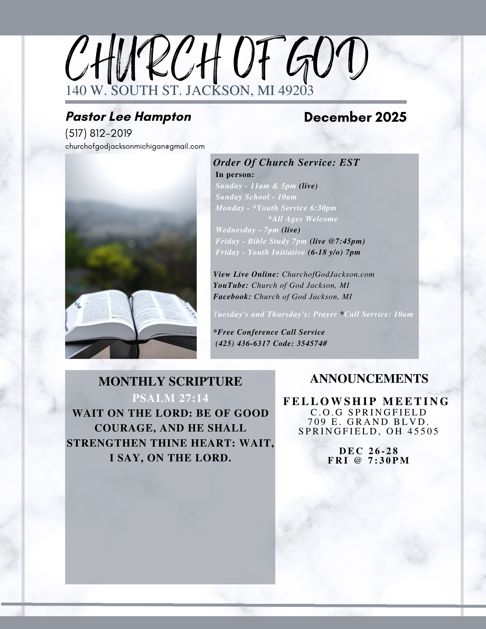 Dec 26 to Dec 28 Springfield Ohio Fellowship Meeting Fri, Dec 26, 2025 7:30 PM Sun, Dec 28, 2025 2:30 PM The Church of God at Springfield Ohio (map) Google Calendar ICS Service Schedule Coming Soon View Event →